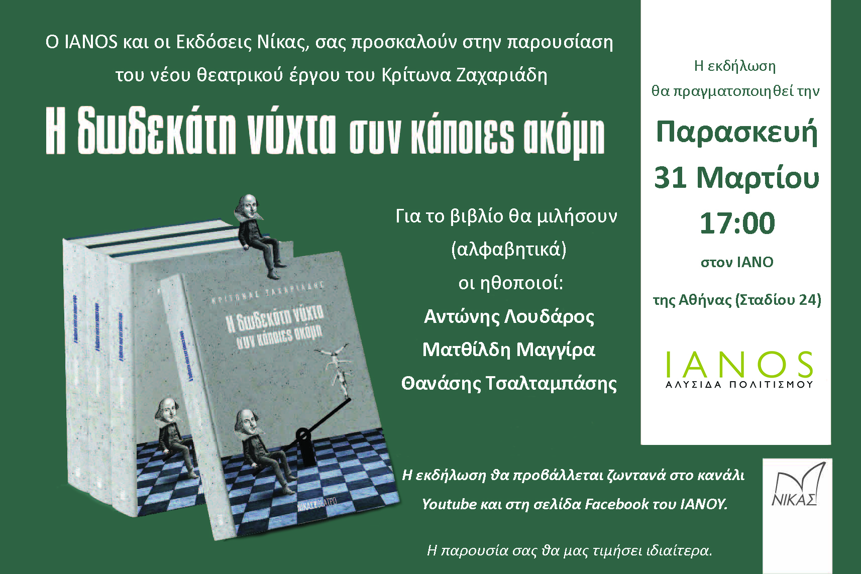 Οι Εκδόσεις Νίκας και ο ΙΑΝΟΣ σας προσκαλούν στην παρουσίαση του νέου θεατρικού έργου του Κρίτωνα Ζαχαριάδη, με τίτλο «Η δωδεκάτη νύχτα συν κάποιες ακόμη».